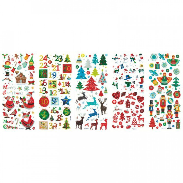 Pochette de 255 stickers scintillants thème Noël. 5 planches thème Noël assortis. Stickers adhésifs repositionnables pour décorer cartes, albums photos, pages de scrapbooking. Adhérent sur tous les supports, papier, carton, bois, verre, métal, plastique.. . Dimensions des planches : 10 x 23 cm.