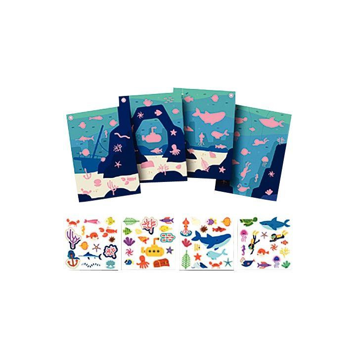 Atelier gommettes multi thématiques connectables. 16 planches A4 individuelles à compléter 16 planches de gommettes individuelles numérotées. Cet atelier est à la fois un travail individuel pour l'enfant mais qui une fois les 16 planches rassemblées, pourra présenter un travail collectif dans la classe en formant une fresque géante de 84 x 118 cm 4 Themes : la montagne, la ferme, la plage et la mer