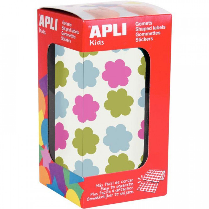 Rouleau gommettes fleurs. Rouleau de gommettes en forme de fleur de dimension 20 mm de diverses couleurs : vert clair, bleu clair et rose, avec un adhésif permanent. Chaque rouleau contient 30 feuilles prédécoupées pour une séparation facile, un total de 900 gommettes par rouleau. Le format parfait à utiliser à l’école, à la garderie, et apprend l'enfant à développer la psychomotricité fine ainsi que la connaissance des couleurs, des formes géométriques et des dimensions, le développement de la logique et la créativité, le travail en équipe ou encore la maîtrise de l’espace, entre autres.