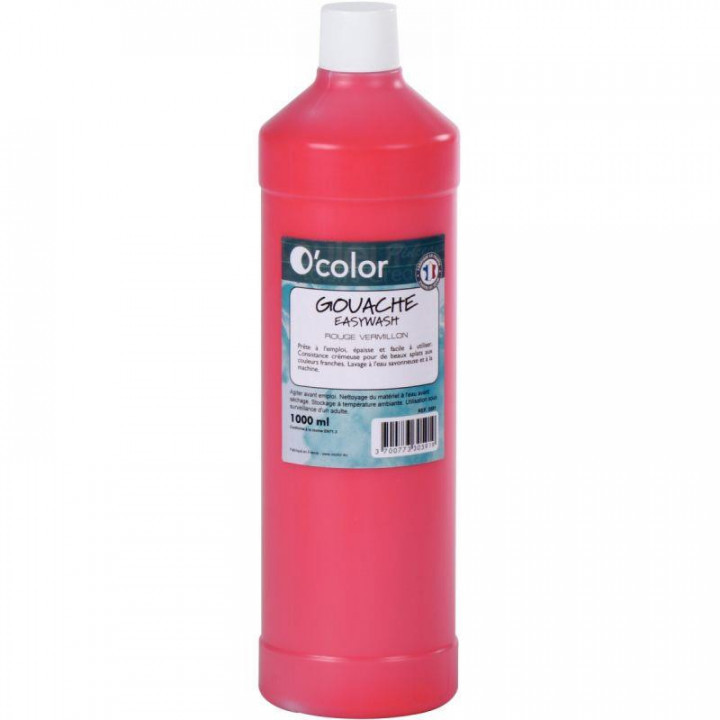 Flacon 1 L de gouache liquide économique O'COLOR coloris rouge vermillon. Gouache EASYWASH lavable à l'eau savonneuse et à la machine. Prête à l'emploi, épaisse et facile à utiliser. Consistance crémeuse pour de beaux aplats aux couleurs franches. Agiter avant emploi. Nettoyage du matériel à l'eau avant séchage. Stockage à température ambiante.