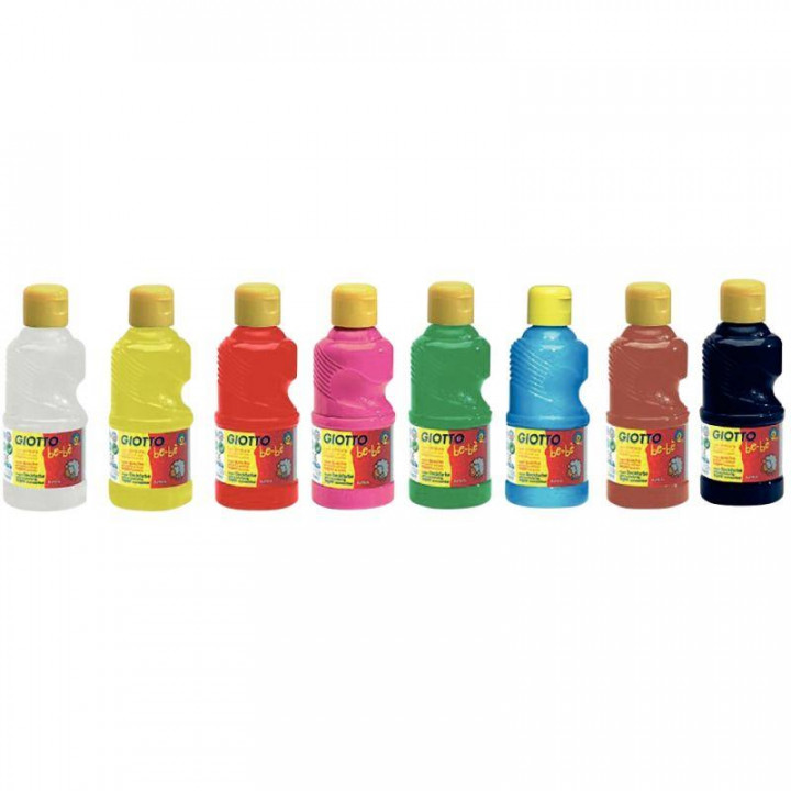 Carton de 8 Flacons 250ml de gouache GIOTTO be-bè, coloris assortis. Couleur vive et brillante. Facile à mélanger et à utiliser. Gouache ultra-lavable, à base d'eau, sans solvant, facile à laver sur la peau et les surfaces non poreuses avec de l'eau et du savon. Idéale pour une première approche de la peinture. 8 coloris assortis : blanc, jaune primaire, rouge, magenta, vert, cyan, marron, noir. Testée dermatologiquement. Dès 2 ans.