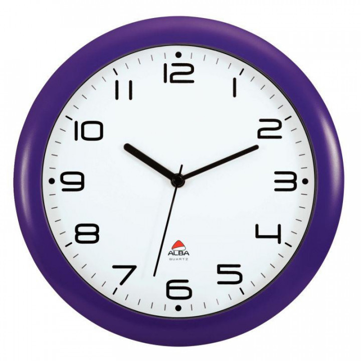 Horloge silencieuse diamètre 30cm prune. Munie d’un mécanisme à quartz haute précision de 2 aiguilles et d’une trotteuse, et d’un design permettant une lisibilité parfaite de l’heure. Silencieuse et précise elle convient à tous les espaces intérieurs. Lisibilité optimale de l’heure grâce à ses grands chiffres noirs sur fond blanc. Cadran an ABS recyclé diam. 30cm. Lentille en verre. Hauteur des chiffres 1.8cm. Poids : 520g. Coloris prune. Fonctionne avec 1 pile LR06/AA non fournie. Garantie 3 ans.