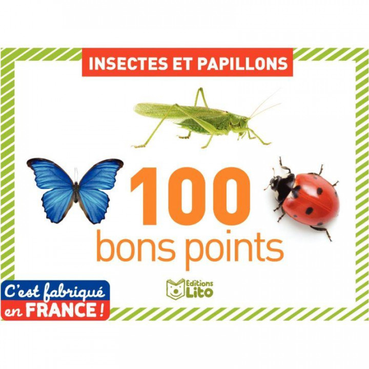 Boite de 100 images les insectes. Boite de 100 images photographiques accompagnées d'un court texte documentaire au verso. 12 insectes et 8 papillons par 5 exemplaires. Insectes : Coccinelle, Fourmi, Libellule, Abeille, Guêpe, Bousier, Grande sauterelle verte, Capricorne, Mante religieuse, Gendarme, Punaise verte, Moustique. Papillons : Morpho, Piéride du chou, Citron de Provence, Monarque, Sphinx tête de mort, Paon du jour, Machaon, Grand paon de nuit