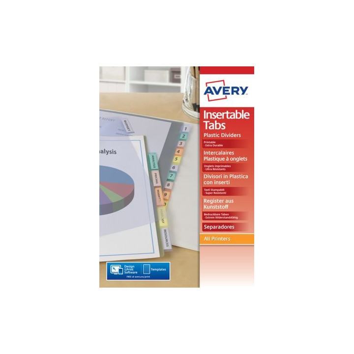 Intercalaires en polypropylène à onglets personnalisables: Réutilisables, il suffit de changer létiquette. Manipulation et identification rapide grâce aux onglets colorés. Fournis avec une planche A4 de bristols prédécoupés interchangeables.
