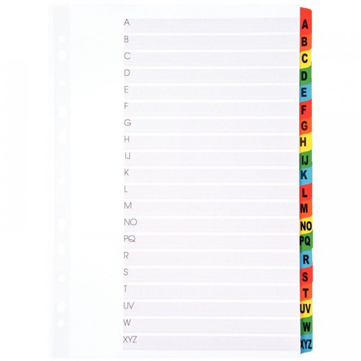 Jeu de 20 intercalaires alphabétiques en carte Mylar, format A4+. Intercalaires en carte blanche 150g avec perforations renforcées. Touches multicolores imprimées recto/verso et renforcées Mylar. Livré avec un sommaire numéroté en bristol à imprimer. Format spécial pour pochettes perforées.