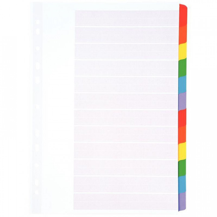 Jeu de 12 intercalaires en carte Mylar, format A4. Intercalaires en carte blanche 150g avec touches neutres multicolores et perforations renforcées Mylar. Livré avec un sommaire neutre en bristol.