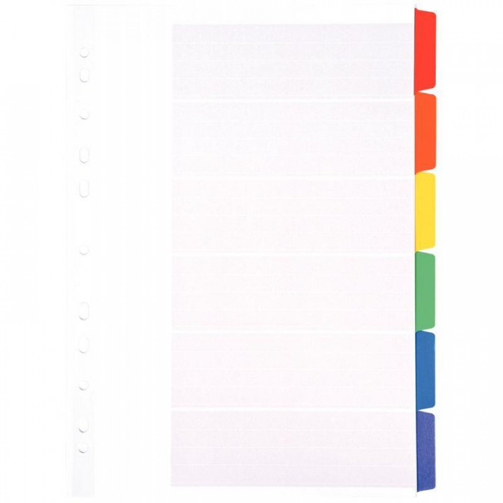 Jeu de 6 intercalaires en carte Mylar, format A4+. Intercalaires en carte blanche 150g avec touches et perforations renforcées. Touches neutres multicolores renforcées Mylar. Livré avec un sommaire neutre en bristol à imprimer. Format spécial pour pochettes perforées.