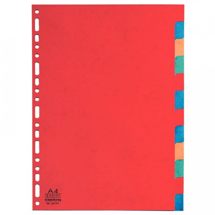 Jeu de 12 intercalaires en carte recyclée 220g, format A4. Carte recyclée 3/10ème. Coloris vifs. Touches neutres. Dimensions extérieures 22,5 x 29,7 cm pour format A4.