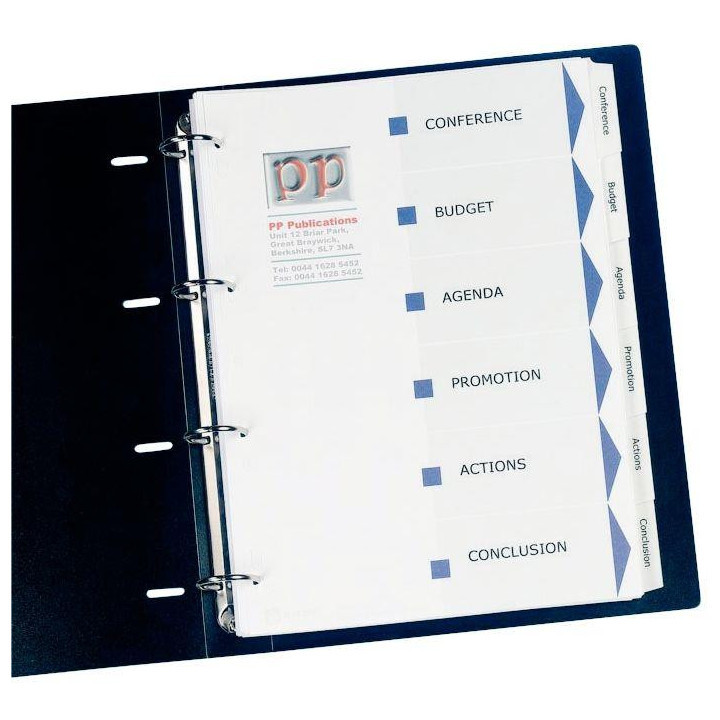 Jeu de 6 intercalaires personnalisables Index Maker en carte format A4. En carte bristol blanche 190 g. Sommaire et touches personnalisables. Réalisez en quelques instants avec votre logiciel habituel des présentations professionnelles et valorisantes : rapports, dossiers, appels d'offres... (formats pré paramétrés sur www.avery.fr/adpo). Sommaire, perforation et touches renforcées. Livré avec une planche d'étiquettes imprimables ou inscriptibles à coller sur les touches des intercalaires.