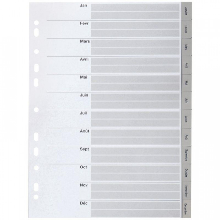 Jeu de 12 intercalaires mensuels en polypropylène gris, format A4. Épaisseur 12/100ème. Sommaire à personnaliser.