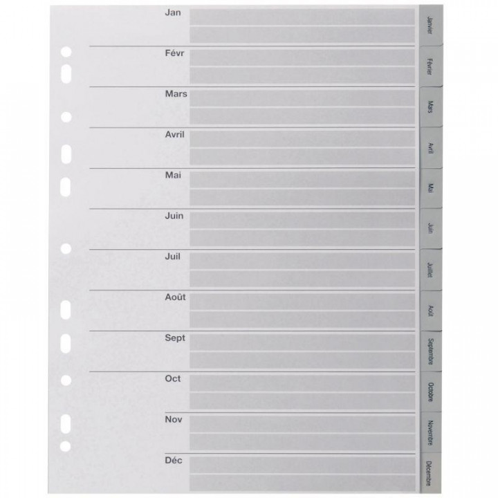 Jeu de 12 intercalaires mensuels en polypropylène gris, format A4+. Épaisseur 12/100ème. Sommaire à personnaliser.
