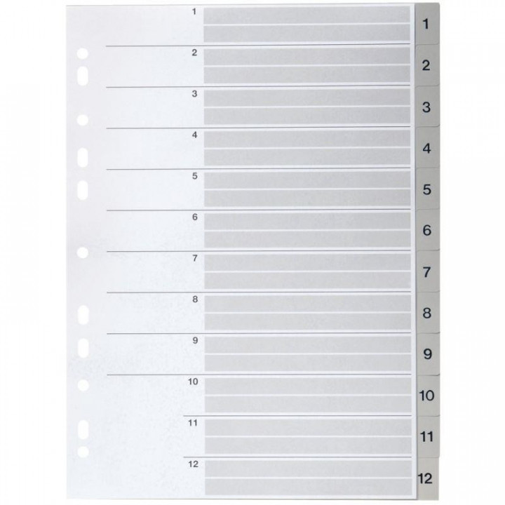 Jeu de 12 intercalaires numériques en polypropylène gris, format A4. Épaisseur 12/100ème. Sommaire à personnaliser.