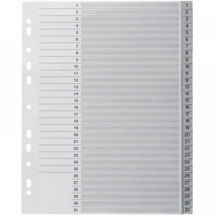 Jeu de 31 intercalaires numériques en polypropylène gris, format A4+. Épaisseur 12/100ème. Sommaire à personnaliser.