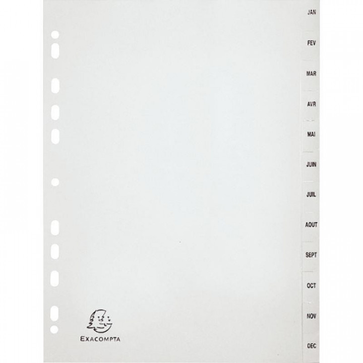 Jeu de 12 intercalaires mensuels en polypropylène gris recyclé, format A4. Intercalaires indéchirables en polypropylène opaque souple 12/100ème pour résister à une utilisation intensive. Polypropylène post consommation, issu du recyclage des déchets ménagers en plastique.
