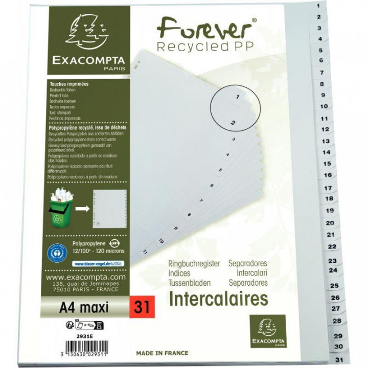 Jeu de 31 intercalaires numériques en polypropylène gris recyclé, format A4+. Intercalaires indéchirables en polypropylène opaque souple 12/100ème pour résister à une utilisation intensive. Polypropylène post consommation, issu du recyclage des déchets ménagers en plastique. Format A4+ = 24,2 x 29,7 cm : les onglets des intercalaires restent toujours visibles même si on utilise des pochettes perforées A4.