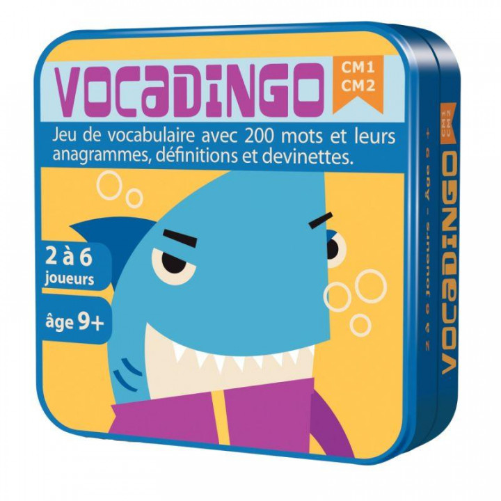 Vocadingo CM1 / CM2. Jeu de carte rigolo pour enrichir son vocabulaire du CM1 au CM2. Au programme : 200 mots avec pour chacun sa définition, son anagramme et sa devinette ! De 2 à 6 Joueurs. A partir de 9 ans