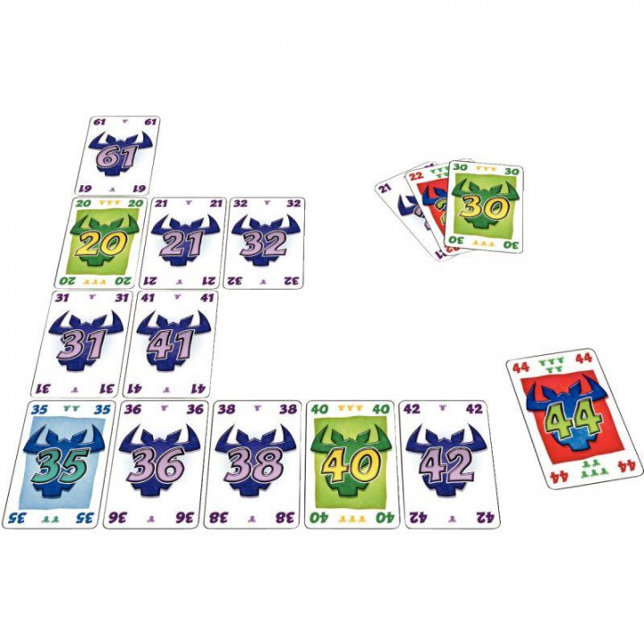 Six qui prend. Contenu de la boîte : 104 cartes de jeux Règle du Jeu : les cartes ont deux valeurs : une valeur numérique (de 1 à 104) qui indique leur future position et une valeur de 1 à 7 « têtes de bœufs » qui correspond à des points de pénalité. Le jeu est de récolter le moins de têtes de bœufs à la fin de la partie. Intérêts Pédagogiques : Ambiance, stratégie et interaction De 2 à 10 joueurs A partir de 8 ans.