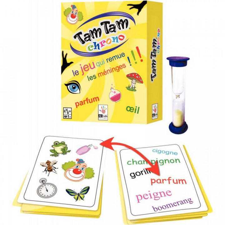 Tam tam chrono. Support d’apprentissage de la lecture, la gamme TAM TAM aide l’enfant à renforcer ses compétences dans le domaine de la lecture et de l’orthographe. Elle permet l’accompagnement de l’enfant dans l’acquisition des correspondances graphèmes-phonèmes, le développement et le perfectionnement de la lecture. L’enfant doit retrouver la paire commune entre 2 cartes : mot-image, mot-mot ou image-image, le plus vite possible. Plusieurs variantes de jeux sont proposées. Contenu : 62 cartes, 1 sablier, et 1 règle des différents jeux. 3 petits jeux malins pour jongler avec les mots. TAM TAM CHRONO utilise les mots irréguliers de la langue française, il permet d’améliorer de façon ludique l’orthographe et la lecture tout en remuant les méninges !! L’enfant doit retrouver la paire commune entre 2 cartes : mot-image, mot-mot, ou image-image, le plus vite possible. A partir de 4 ans Durée de la partie 10 minutes.