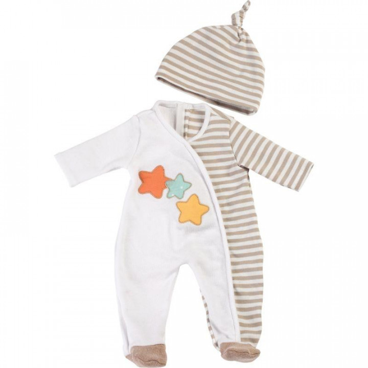Grenouillère pour poupée 40 cm. Avec un bonnet. En tissu doux, livré sur un cintre. Convient aux poupées fille ou garçon de 40 cm. Finitions très soignées, couleurs douces. Lavable à 30°C.