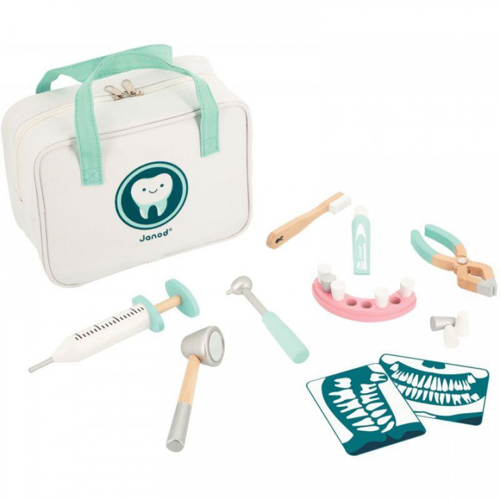 Mallette du dentiste en bois. Mallette en tissu zippée avec 2 poignées de transport et 9 accessoires en bois certifié FSC : un dentier avec 8 dents amovibles (6 blanches et 2 grises), une brosse à dents (L.12 cm), du dentifrice, une seringue pour l'anesthésie, une pince (L.12 x l.4 x ép.1,2 cm), un miroir et une fraise dentaires, et 2 radiographies de la mâchoire (carton épais). Jouet d'imitation qui développe l'imagination et le vocabulaire des enfants. Support pédagogique pour dédramatiser la visite chez le dentiste et apprendre à prendre soin de ses dents dès le plus jeune âge. Peinture à base d’eau. Dimensions de la mallette : L.22 x l.17 x ép.8 cm. Dès 3 ans.
