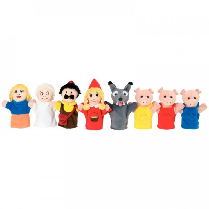 Valisette de 8 marionnettes, le Petit chaperon rouge et les 3 petits cochons. Le petit chaperon rouge, la mère, la grand-mère, le loup, le garde forestier et les 3 petits cochons (H.22 cm). Nettoyage à sec. Livrées dans une boite avec poignée en carton épais. Dès 3 ans. Pour une représentation théâtrale, plusieurs fichiers sont téléchargeables sur le site du fournisseur : 2 histoires classiques, 1 guide pédagogique et 1 mode d'emploi, le scénario des histoires et plusieurs paysages d'arrière-plan colorés. Le lien : https://akroseducational.com/fr/p/marionettes-petit-chaperon-rouge-et-les-trois-petits-cochons/
