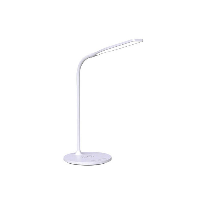 Lampe IRENE Blanc. LED, 6 W, 300 Lumens. Tête orientable, inclinable et pivotante. Bras Flexible. 3 couleurs (3000° K chaud) - 3800° K (neutre) - 5700° K(Froid)).Mise en veille automatique. Chargeur par induction sans fil (15W). Fonctionne sur secteur. Module LED intégré. Socle Ø 17cm. Tête Ø 29 cm. H.34 cm. Poids :0.335 kg. Garantie 2 ans.