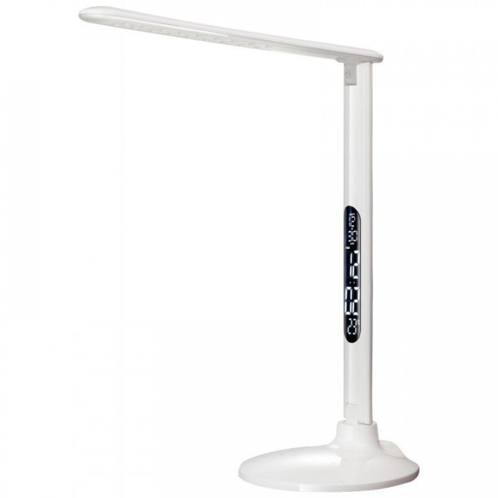 Lampe LED Success blanc. Lampe de bureau LED 10W. Réflecteur pliable en abs teinté blanc. Fonction horloge, calendrier, thermomètre digital, réveil. Interrupteur sensitif 5 positions. Réglage de la température de couleur. Prise USB. Module LED intégré. Garantie 2 ans. Durée de vie : 25 000h Ce luminaire contient une source de classe : E