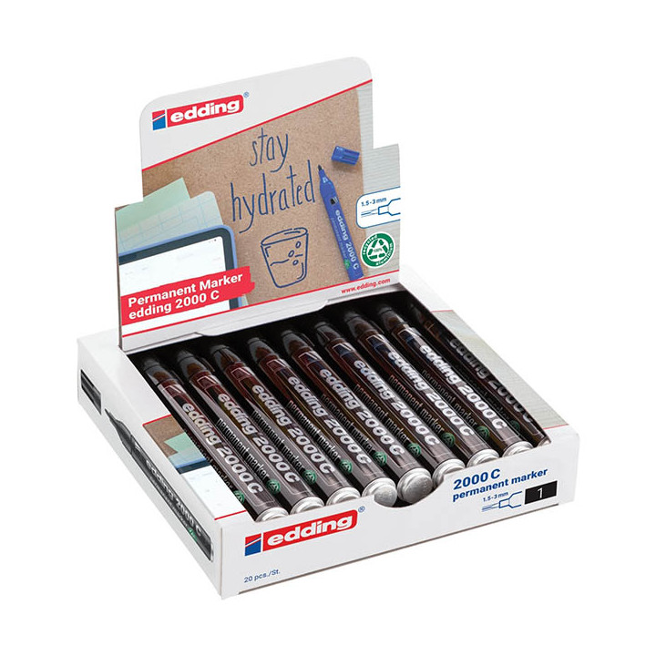 Boite de 20 marqueurs permanents E-2000C noirs. Pointe ogive 1,5 à 3mm. Corps en aluminum recyclé. Résistant à l'eau et à la lumière. Séchage rapide, faible odeur.