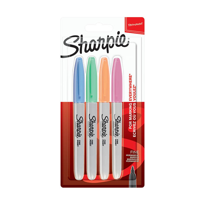 Blister de 4 marqueurs permanents Sharpie pastel. Pointe fine 1mm. Corps plastique. Format stylo. Encre résistante à l'eau. Coloris pastel : vert menthe, pêche, bleu ciel, rose.