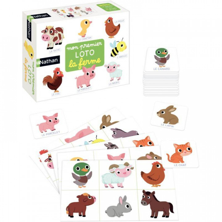Mon premier loto de la ferme. Contenu de la boîte : 5 planches (14.4x9cm) en carton épais et 30 jetons. But du jeu : chaque enfant prend une ou plusieurs planches. ils piochent à tout de rôle un jeton, le nomme, le montre aux autres et le dépose sur sa planche si il y a une correspondance. Du poussin à la vache, du hérisson à l’écureuil : indispensable pour les premières découvertes. A partir de 2 ans.