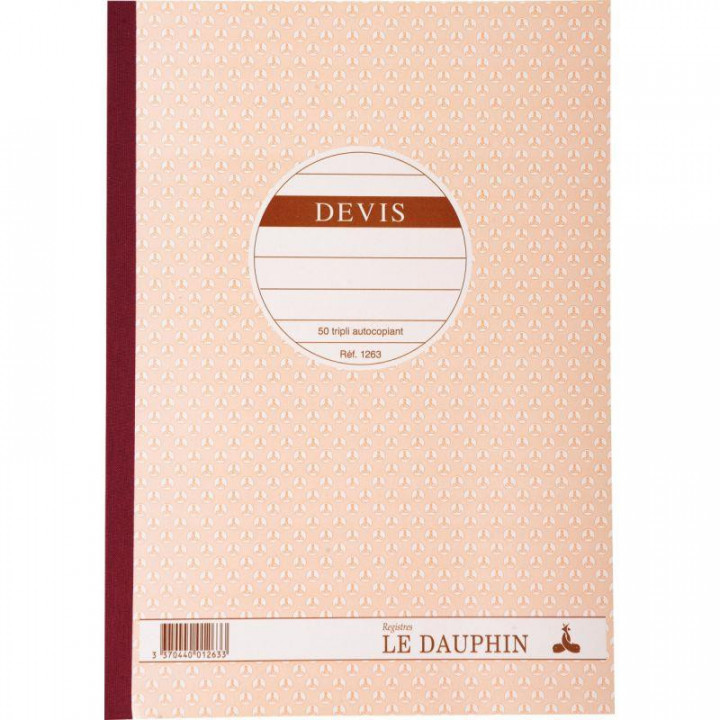 Manifold Devis NCR format 21 x 29,7 cm 50 triplicatas autocopiants. NCR = No Carbon Required (Papier qui s'imprime tout seul quand on appuie dessus). Papier autocopiant texté de 50 triplicata pour les DEVIS. 50 feuilles numérotées et autocopiants en 3 exemplaires (1 original et 2 copies). Couverture vernie - couleur AVOINE. Format vertical 29,7 x 21 cm. Les 1er et 2ème feuillets sont micro perforés et se détachent facilement, le 3ème feuillet reste dans le carnet.