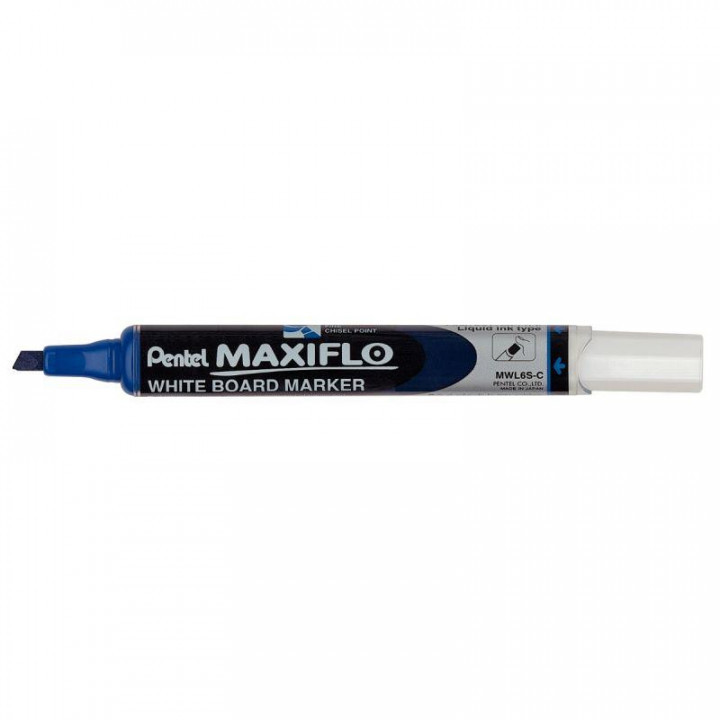 Marqueur tableau blanc Maxiflo pointe biseautée 4,6mm bleu. Corps fin. Pointe 4.6mm. Système exclusif avec bouton poussoir. Encre liquide à base d'alcool sans xylène ni toluène, fluide et lumineuse. Niveau d'encre visible.