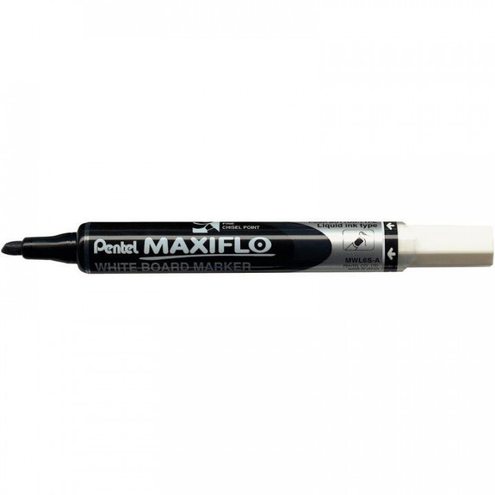 Marqueur tableau blanc Maxiflo pointe biseautée 4,6mm noir. Corps fin. Pointe 4.6mm. Système exclusif avec bouton poussoir. Encre liquide à base d'alcool sans xylène ni toluène, fluide et lumineuse. Niveau d'encre visible.