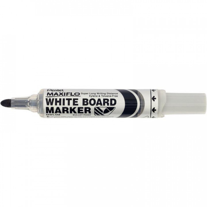Marqueur tableau blanc Maxiflo pointe ogive 6mm noir. Clapet/soupape permettant le réamorçage en encre de la pointe, grâce à son bouton poussoir. Marqueur à encre liquide, fluide et lumineuse, à base d'alcool, sans xylène ni toluène. Niveau d'encre visible