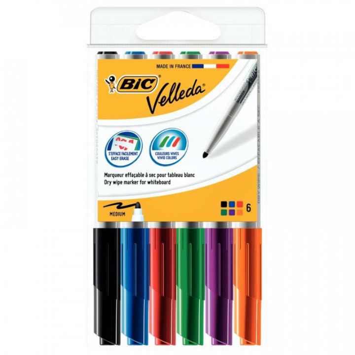 Pochette de 6 feutres Velleda 1741 pointe moyenne assortis. Pointe moyenne 4,5mm, tracé: 1,4 mm. Encre cétone. Corps plastique, capuchon ventilé. Coloris : bleu, noir, rouge, vert, orange, violet.