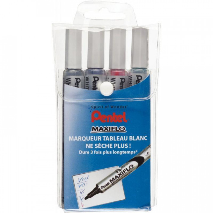Boîte de 4 marqueurs tableaux blancs Maxiflo 4mm assortis. Pointe ogive fine avec systéme exclusif de réencrage par bouton poussoir assortis