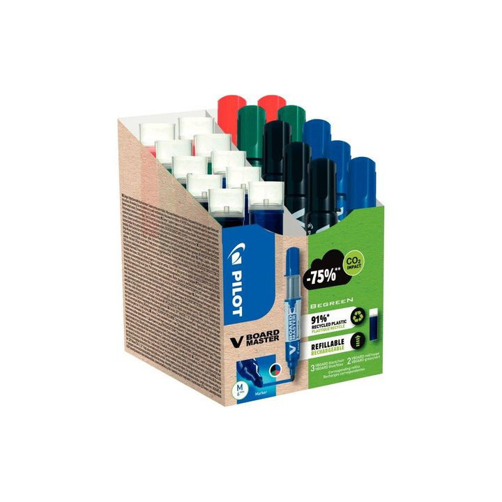Pack de 10 marqueurs V-Board Master + 10 recharges assorties. Encre liquide très lumineuse et débit régulier. Rechargeable.Fabriqué à 91% à base de plastique recyclé (hors éléments consommables)