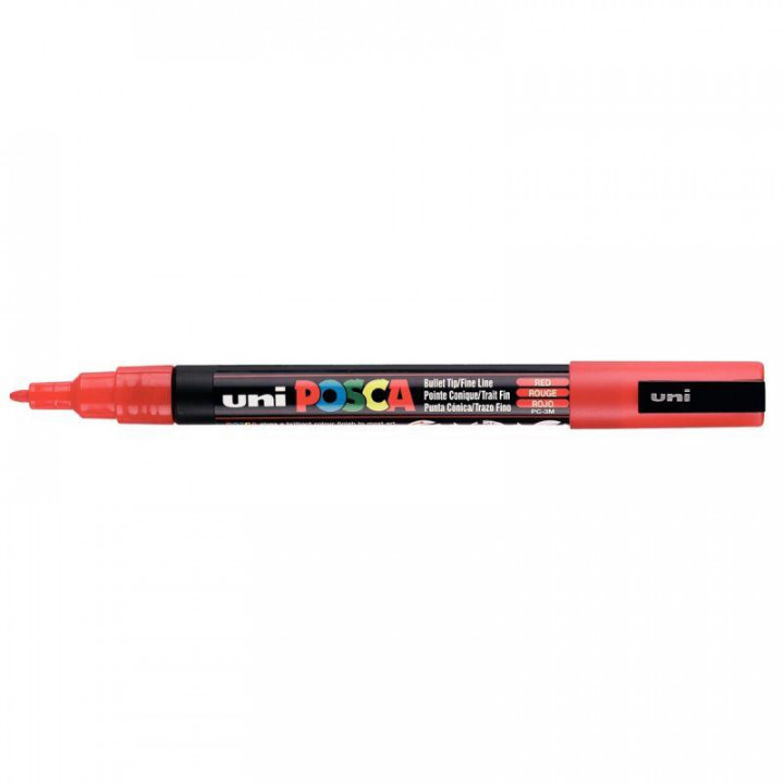Marqueur Posca pointe fine ogive rouge. Les couleurs sont denses, opaques, couvrantes, superposables et ne pâlissent pas à la lumière. L'encre est inodore. S'applique sur tous supports : papier, bois, plastique, verre, métal… Peint, dessine, écrit et marque. Pour des applications illimitées !