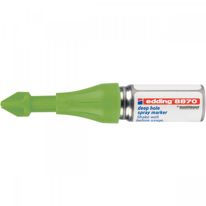 Marqueur de précision en spray E.8870. Craie en spray avec mécanisme de pompe breveté pour un marquage non permanent dans les endroits difficiles d'accès, sur presque tous les matériaux. Permet de marquer des trous d'une profondeur maximale de 50 mm et d'un diamètre de 3 à 13 mm. Peut être utilisé sous n'importe quel angle et à n'importe quelle hauteur et sur presque tous les matériaux. Facile à utiliser d'une seule main. Couleur vert fluo.