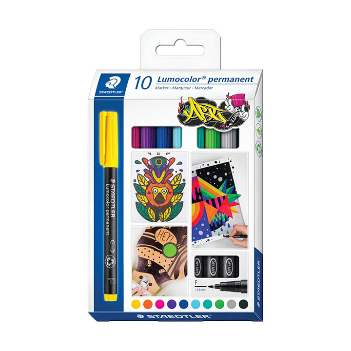 Pochette de 10 feutres Lumocolor permanent 0,6mm assortis. Pour la rétroprojection et la plupart des surfaces, encre permanente dry safe permettant de laisser décapuchonner plusieurs jours sans sécher (ISO 554), ne bave pas, quasi inodore, résistant à l'eau sur presque toutes les surfaces, séchage rapide sur le support idéal pour les gauchers, avec clip, corps et capuchon en polypropylène garantissant une longue durée de vie, rechargeable, pointe fine 0,6 mm.