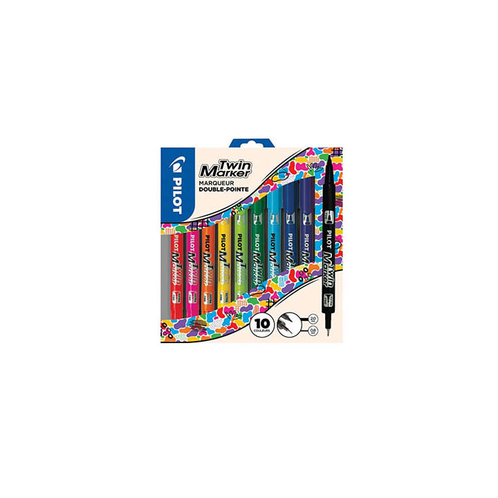 Pochette de 10 marqueurs Twin Marker assortis. Pointe : 0,8 / 2mm. Ecriture : 0,4 / 0,5 mm. Pointe fine fibre polyacétate et acrylique. Double pointe: Pointe extra-fine/fine. Coloris assortis.