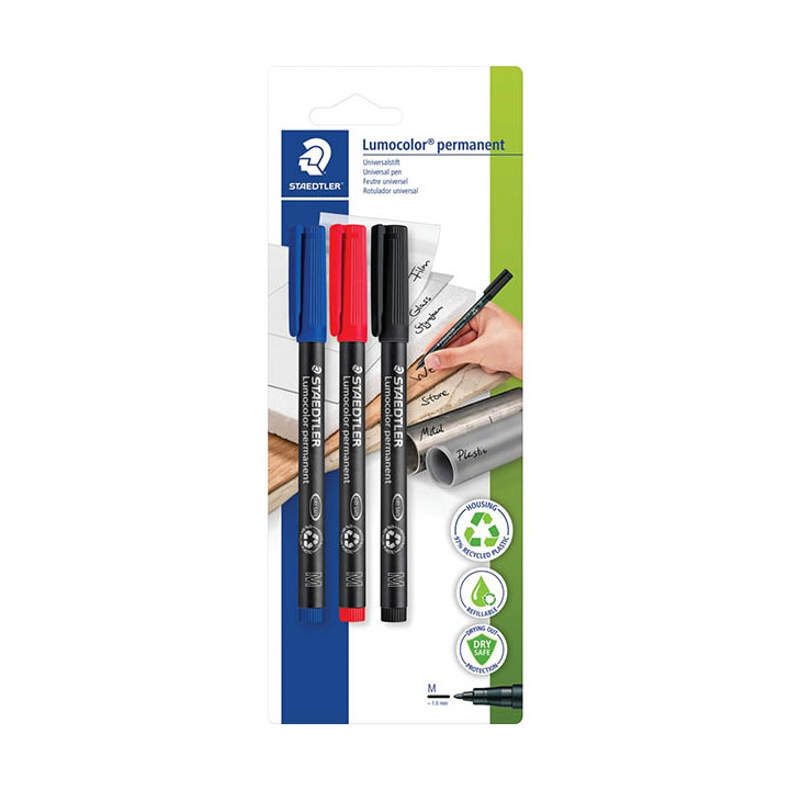 Blister de 3 feutres Lumocolor permanents 1,0mm assortis. Pour la rétroprojection et la plupart des surfaces, encre permanente dry safe permettant de laisser décapuchonné plusieurs jours sans sécher (ISO 554), ne bave pas, quasi inodore, résistant à l'eau sur presque toutes les surfaces, séchage rapide sur le support idéal pour les gauchers, avec clip, corps et capuchon en polypropylène garantissant une longue durée de vie, rechargeable, pointe moyenne 1,0 mm.