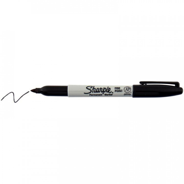 Marqueur Sharpie pointe fine ogive noir. Pointe fine 1mm. Corps plastique. Format stylo. Encre résistante à l'eau.