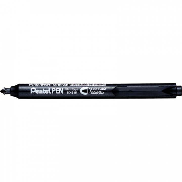 Marqueur permanent rétractable NXS15 noir. Pointe ogive moyenne 4,5 mm. Encre indélébile à base d'alcool sans xylène ni toluène. Clapet hermétique évitant tout séchage de la pointe. Utilisation sur tous supports et pour tous usages: carton, plastique, bois...