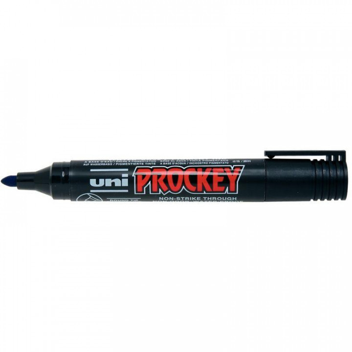 Marqueur Prockey pointe moyenne ogive bleu. Corps plastique. Marqueur encre à pigmentation à base d'eau. Ce marqueur à base d'eau est totalement inodore, utilisable sur pratiquement tous les supports y compris sur les films OHP. L'Uni Prockey est totalement résistant à l'eau une fois qu'il est sec. L'encre à pigmentation à base d'eau utilisée résiste également à la lumière.