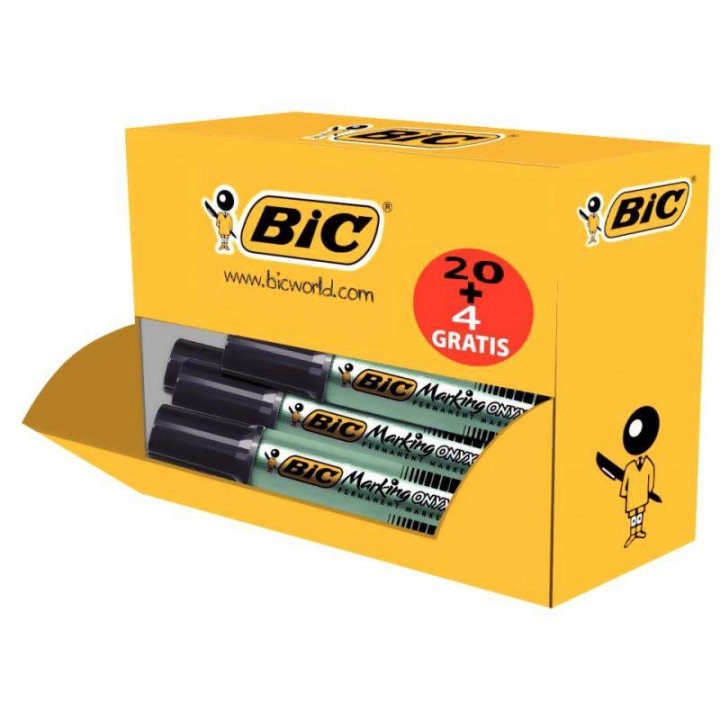 Pack de 24 marqueurs permanents 1481 pointe biseautée noirs dont 4 gratuits. Base solvant indélébile. Corps métal standard. Encre à fort pouvoir indélébile. Idéal pour supports sales ou graisseux métal, plastique. permanent. Largeur de 3,7 à 5,2 mm.