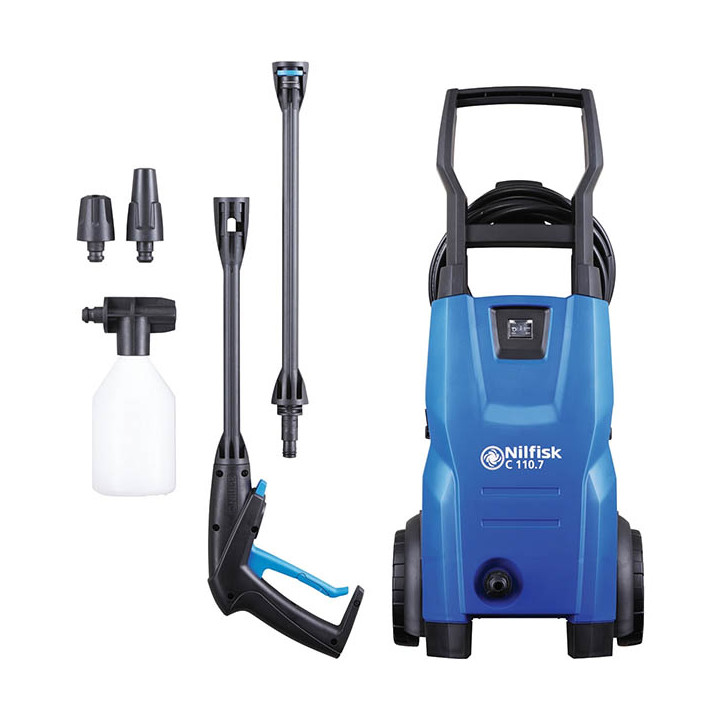 Nettoyeur pression 110 bar. Léger et portable, le nettoyeur haute pression à 110 BAR . Il offre une buse à jet plat/ crayon Tornado à raccord rapide, Buse Powerspeed à raccord rapide à jet rotatif, Débouche buse, Pulvérisateur de mousse à raccord rapide. POMPE EN ALU TRÈS FIABLE, RACCORD RAPIDE LAITON ET TOURNANT DU FLEXIBLE 360° «QUICK COUPLING», RACCORD RAPIDE DES ACCESSOIRES «CLICK & CLEAN», RANGEMENT DES ACCESSOIRES ET DU FLEXIBLE, FLEXIBLE DE 5M Garantie : 2 ans.