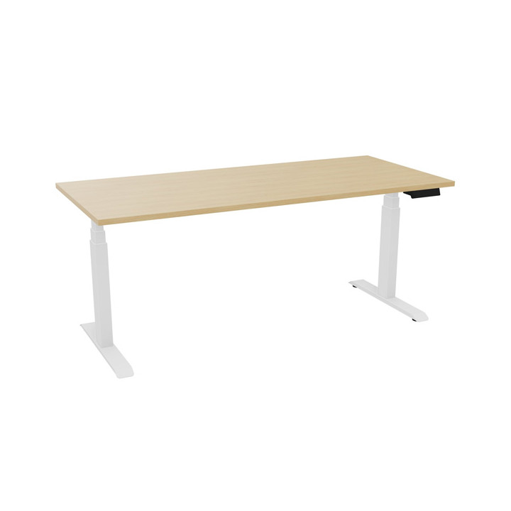 Bureau individuel Slade L180xP80cm plateau chêne naturel/piètement blanc. Réglable en hauteur électriquement. Plateaux: Panneaux ép. 25mm, décor traîté anti-reflets. Chants en ABS ép.2mm. Classement au feu M3. En version Bench: goulotte métallique double d'électrification pour le passage des boîtiers prises et câbles. Piètements: 2 piètements colonnes métalliques section 80x50mm. 3 bras télescopiques pour le réglage motorisé. En version Bench: piètements reliés par une barre métallique transverse L78,5xH8xP5cm ép.3mm. Système de réglage électrique en hauteur de 650 à 1300mm. Poids supporté pour un plan de travail: 120kg. Boîtier de commande digital avec 4 mémoires de position. Système anti-collision intégré. Système anti-collision plus sensible vendu en option. Garantie 5 ans.