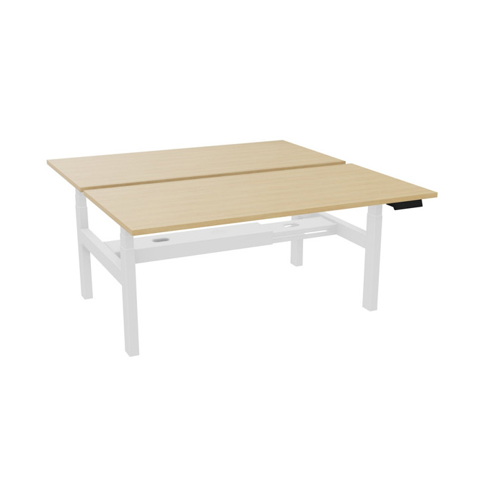 Bureau partagé Slade L160xP80cm plateau chêne naturel/piètement blanc. Profondeur totale 166,5cm. Réglable en hauteur électriquement. Plateaux: Panneaux ép. 25mm, décor traîté anti-reflets. Chants en ABS ép.2mm. Classement au feu M3. En version Bench: goulotte métallique double d'électrification pour le passage des boîtiers prises et câbles. Piètements: 2 piètements colonnes métalliques section 80x50mm. 3 bras télescopiques pour le réglage motorisé. En version Bench: piètements reliés par une barre métallique transverse L78,5xH8xP5cm ép.3mm. Système de réglage électrique en hauteur de 650 à 1300mm. Poids supporté pour un plan de travail: 120kg. Boîtier de commande digital avec 4 mémoires de position. Système anti-collision intégré. Système anti-collision plus sensible vendu en option. Garantie 5 ans.