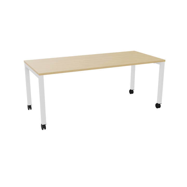 Table L180 cm x P80 cm x H73,5 cm Perform Mobile plateau chêne naturel/piétement blanc. Plateau mélamine avec obturateur. Piètement arche carrée fixe. Métal lisse. Sur roulettes. Garantie 5 ans.